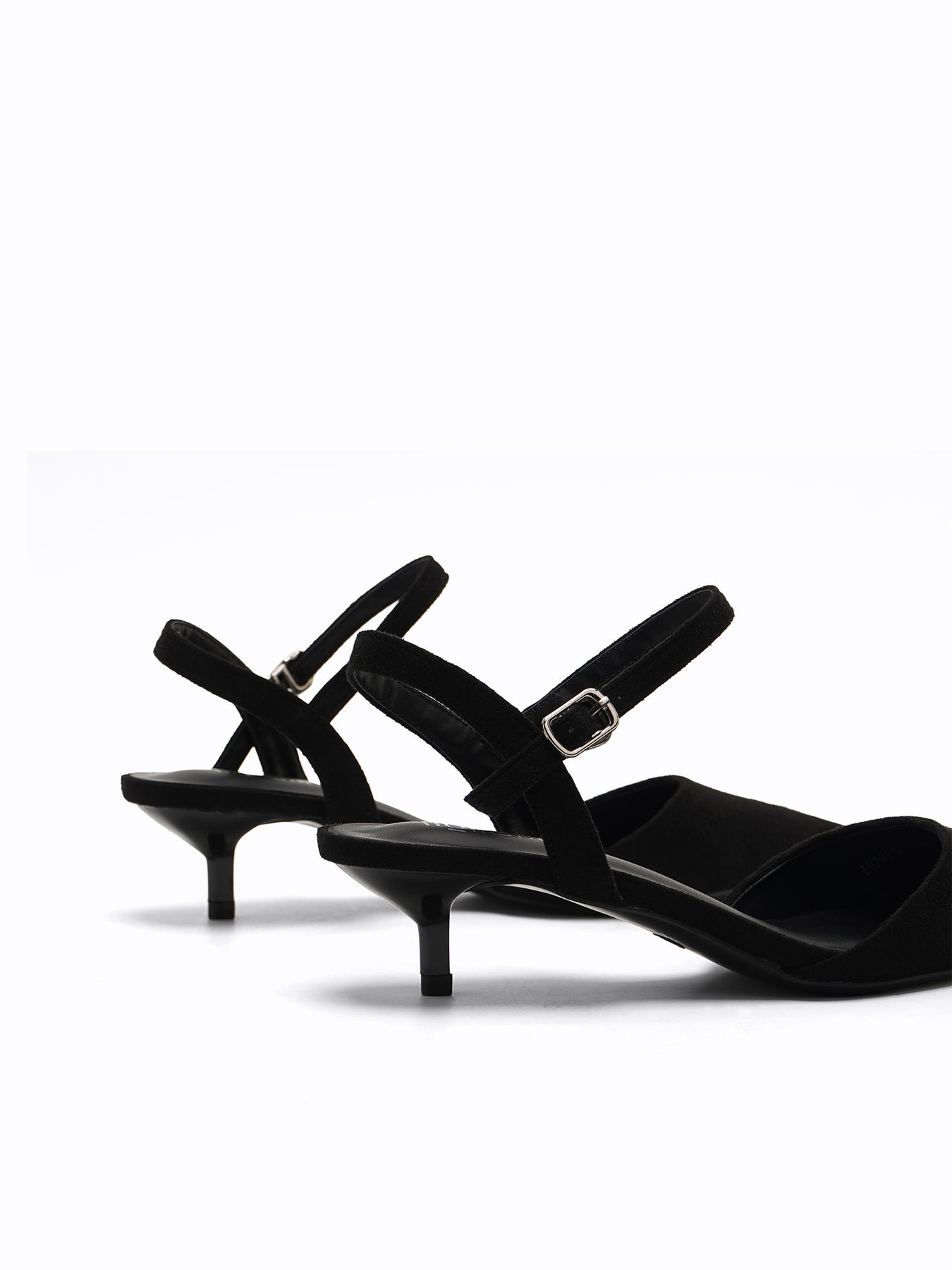 The Moses Slingback Pumps offer sophisticated style with all-day comfort. Features include a chic pointed toe, elegant d'Orsay cut, and a luxurious microsuede finish. The shoes are finished with a comfortable kitten heel and an adjustable slingback strap for a secure fit.