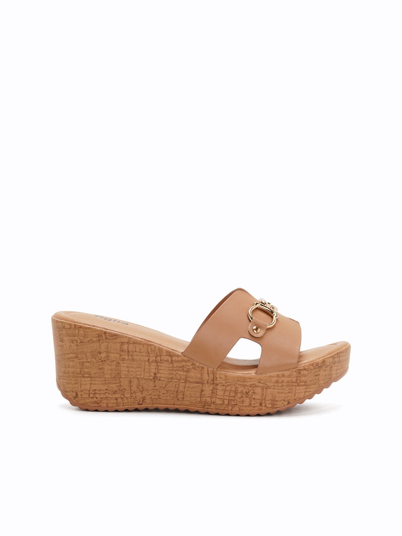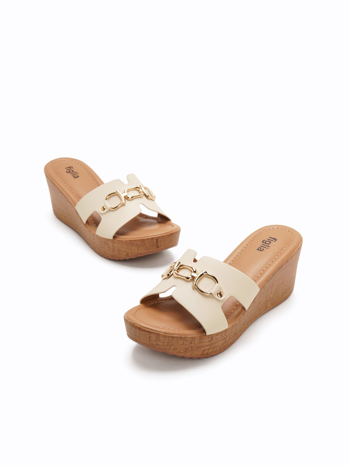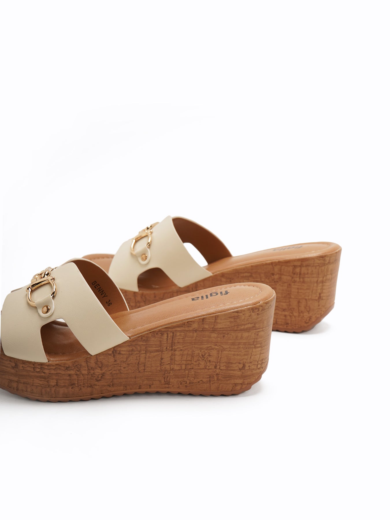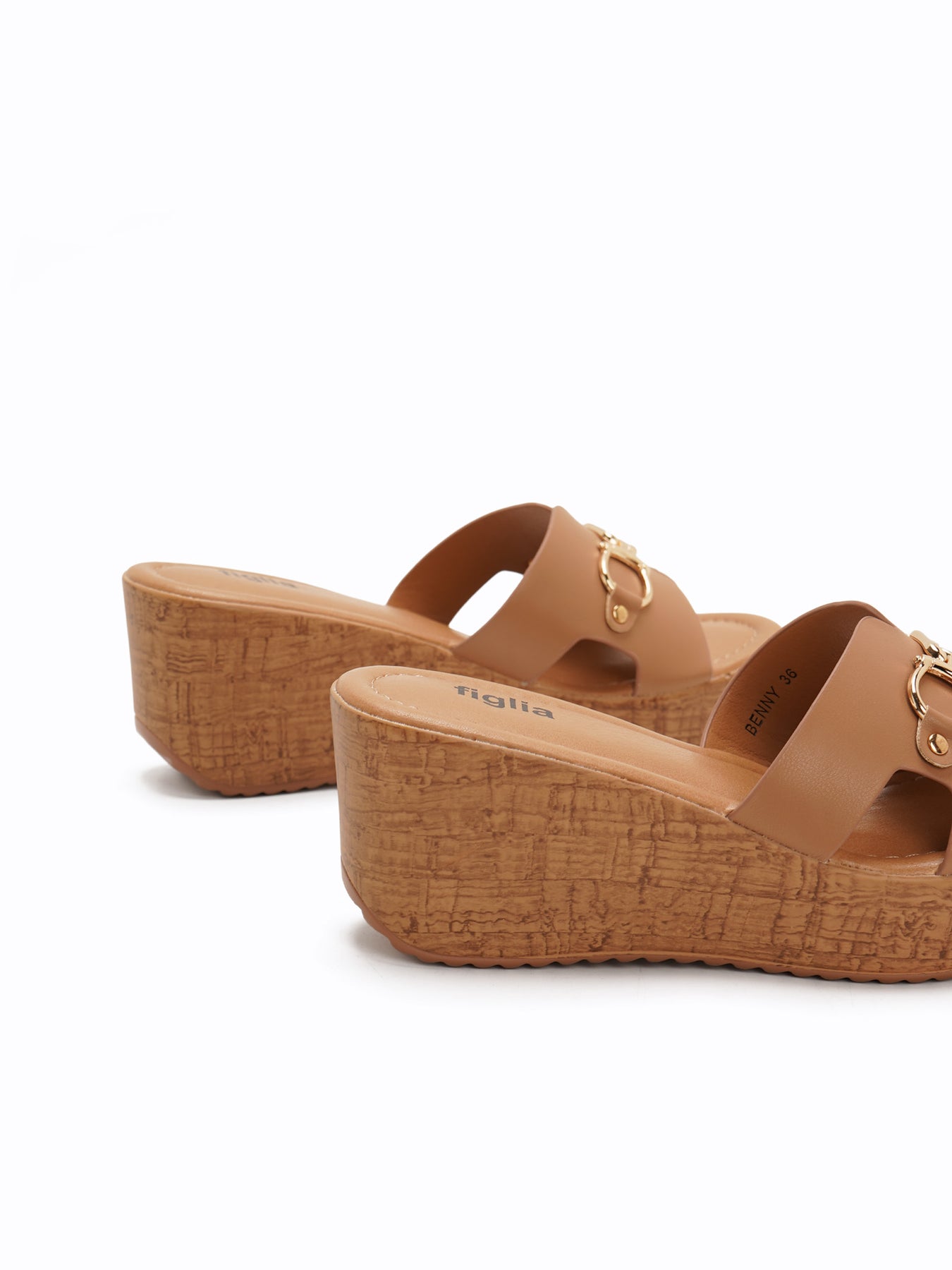 The Benny Wedge Slides feature a platform wedge with a wood-like texture and a wide upper strap accented by a polished gold-tone detail for a classic, elevated look.