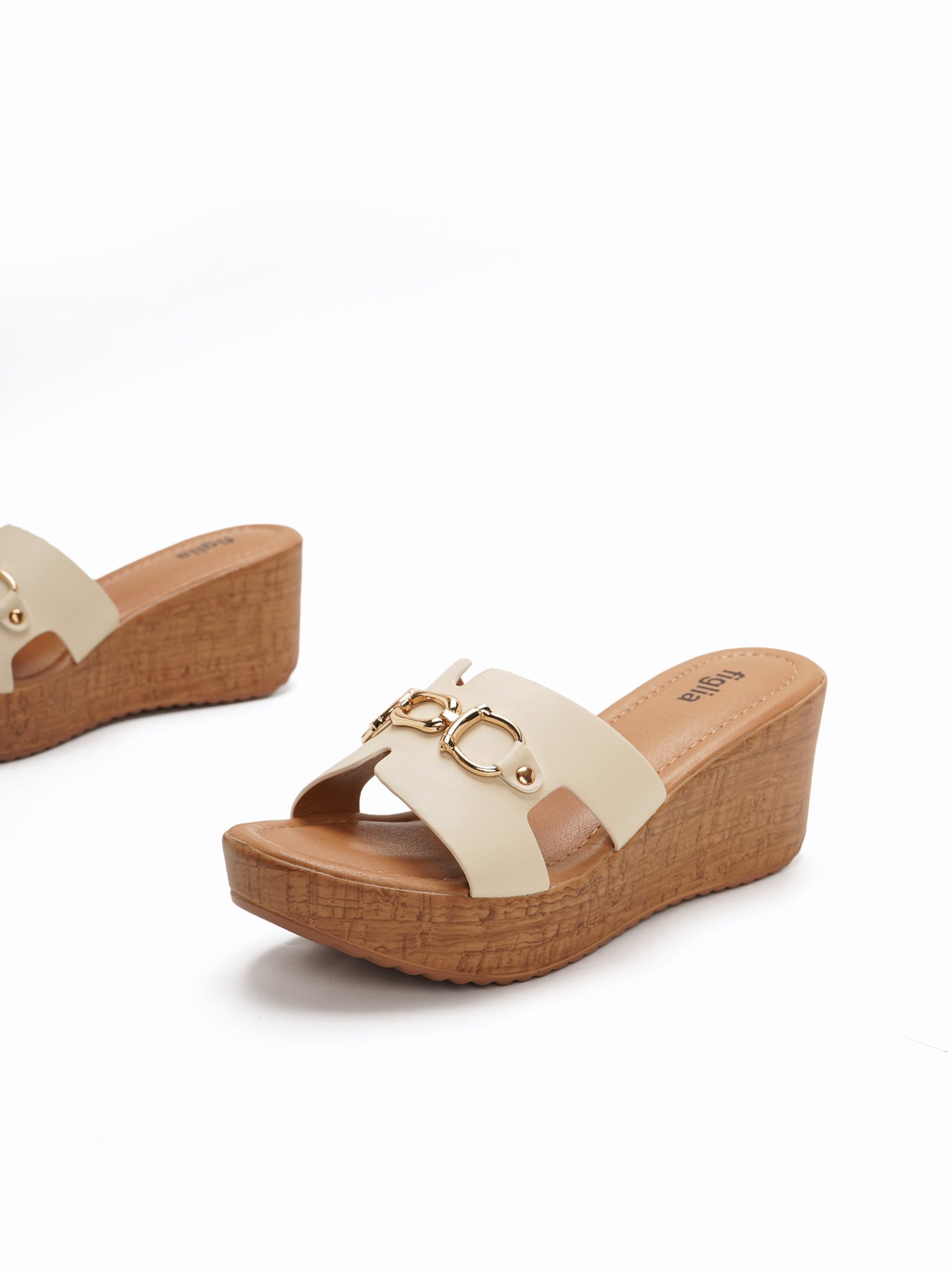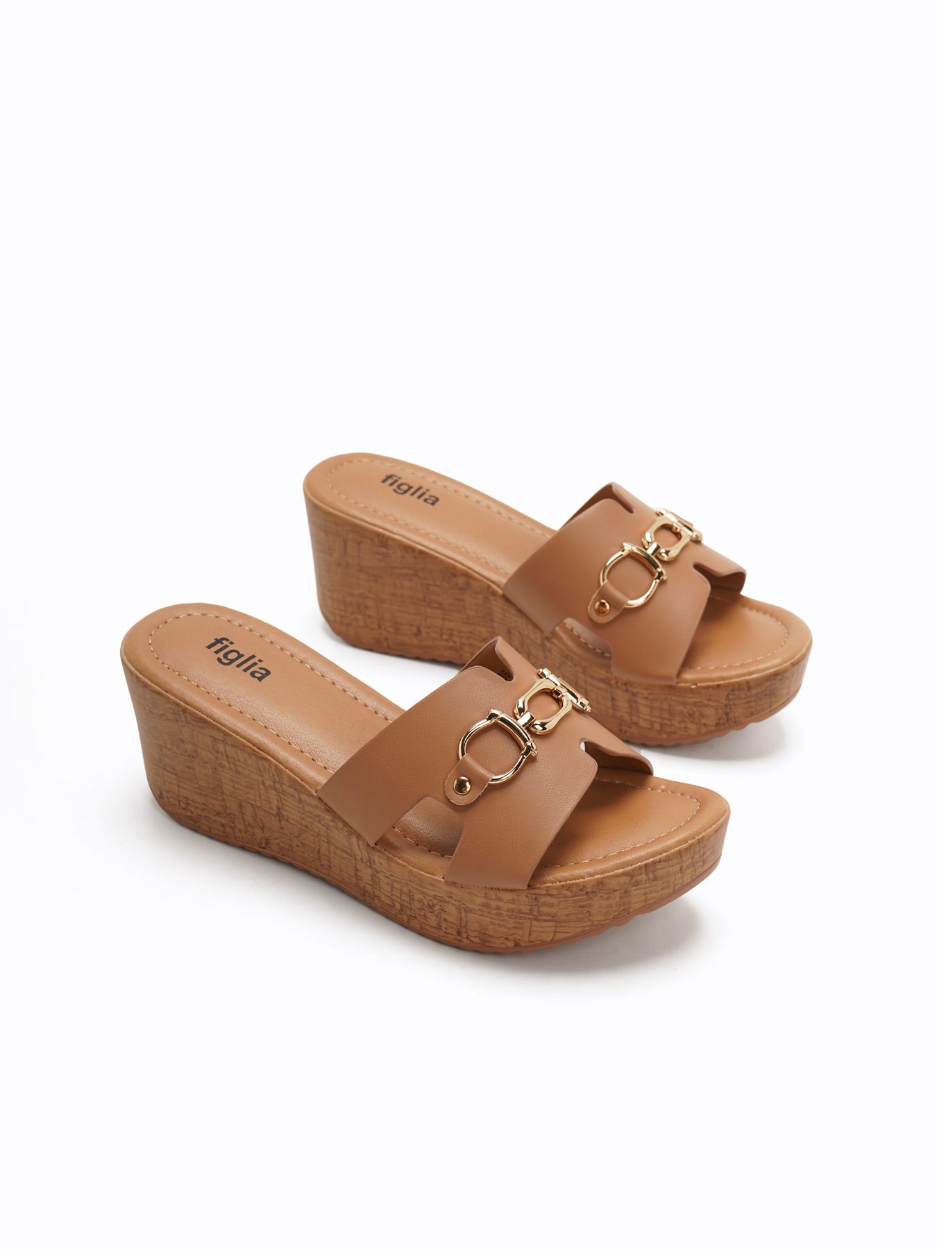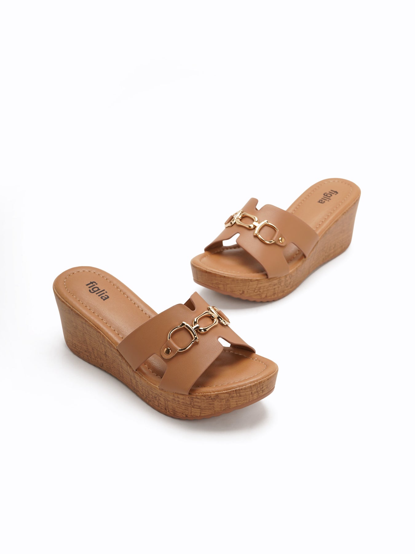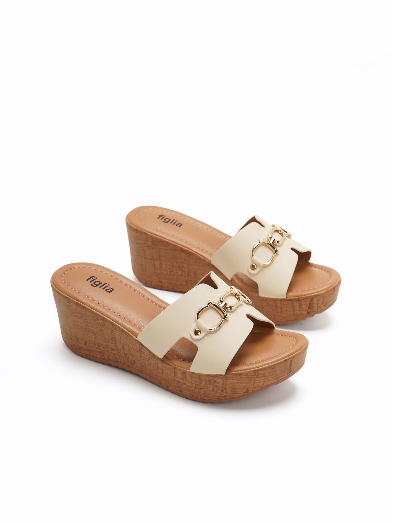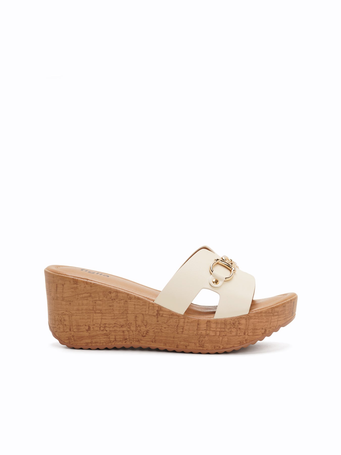 The Benny Wedge Slides feature a platform wedge with a wood-like texture and a wide upper strap accented by a polished gold-tone detail for a classic, elevated look.
