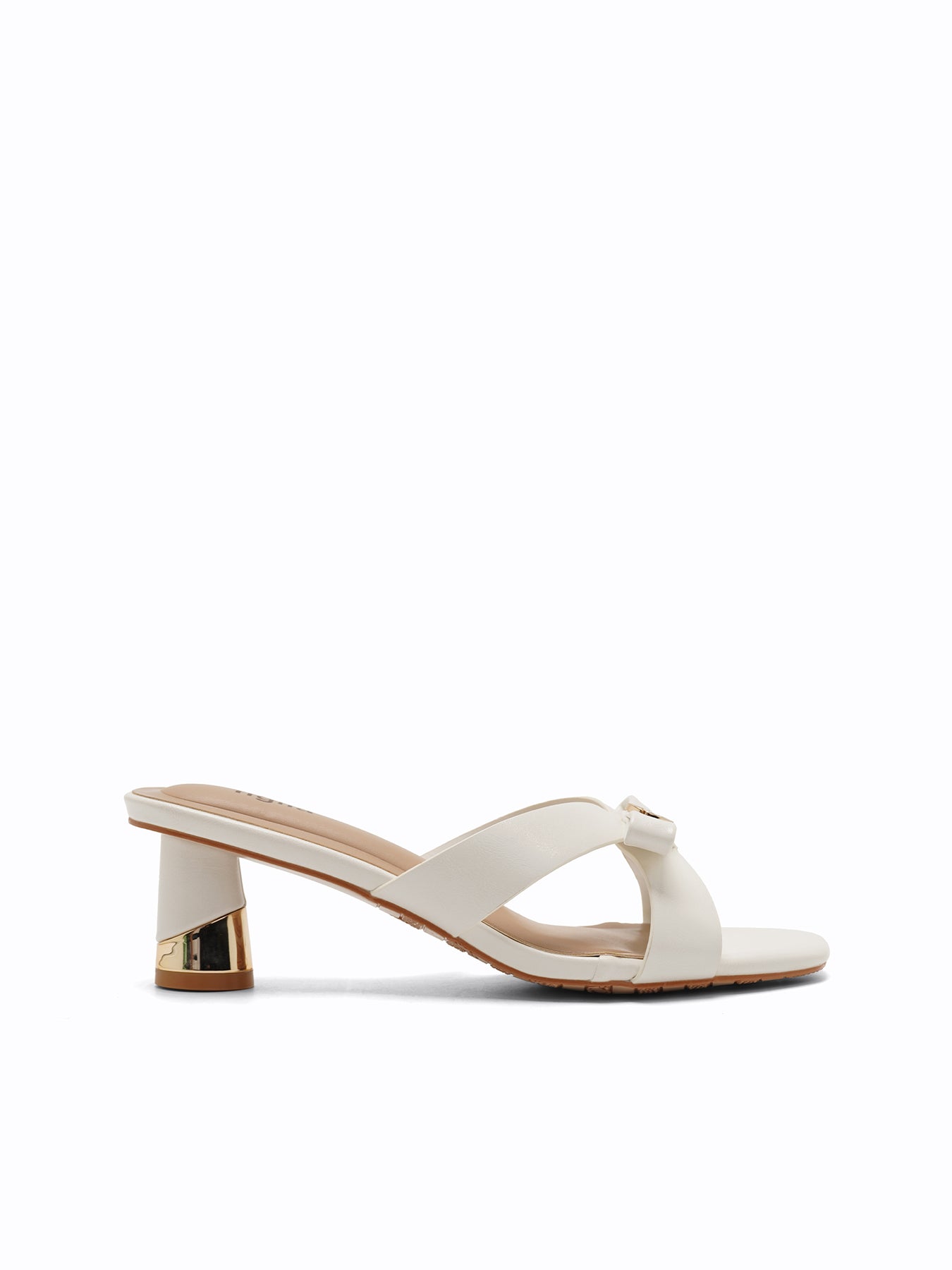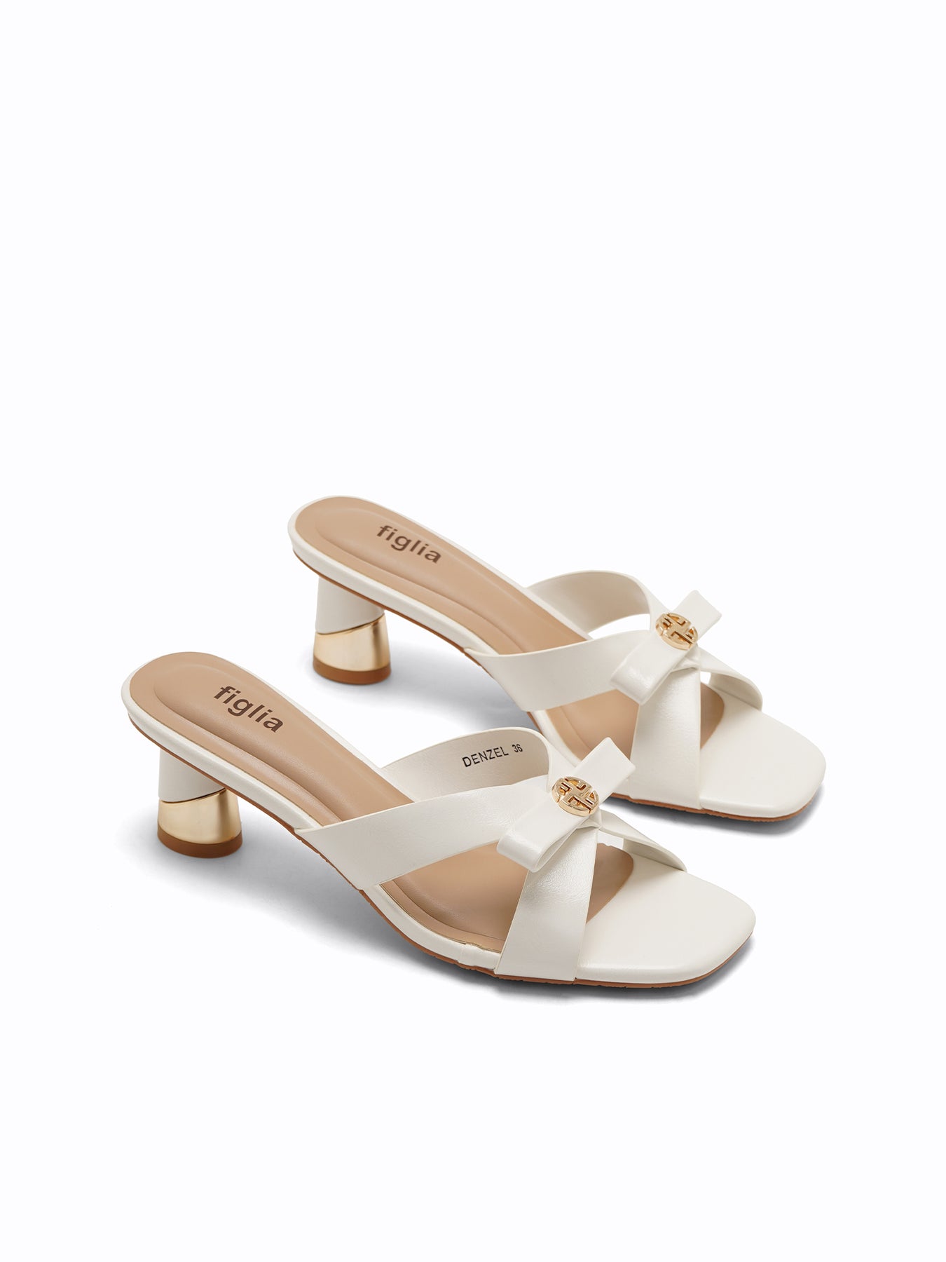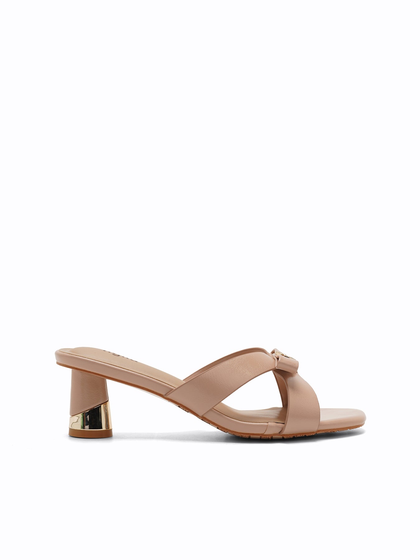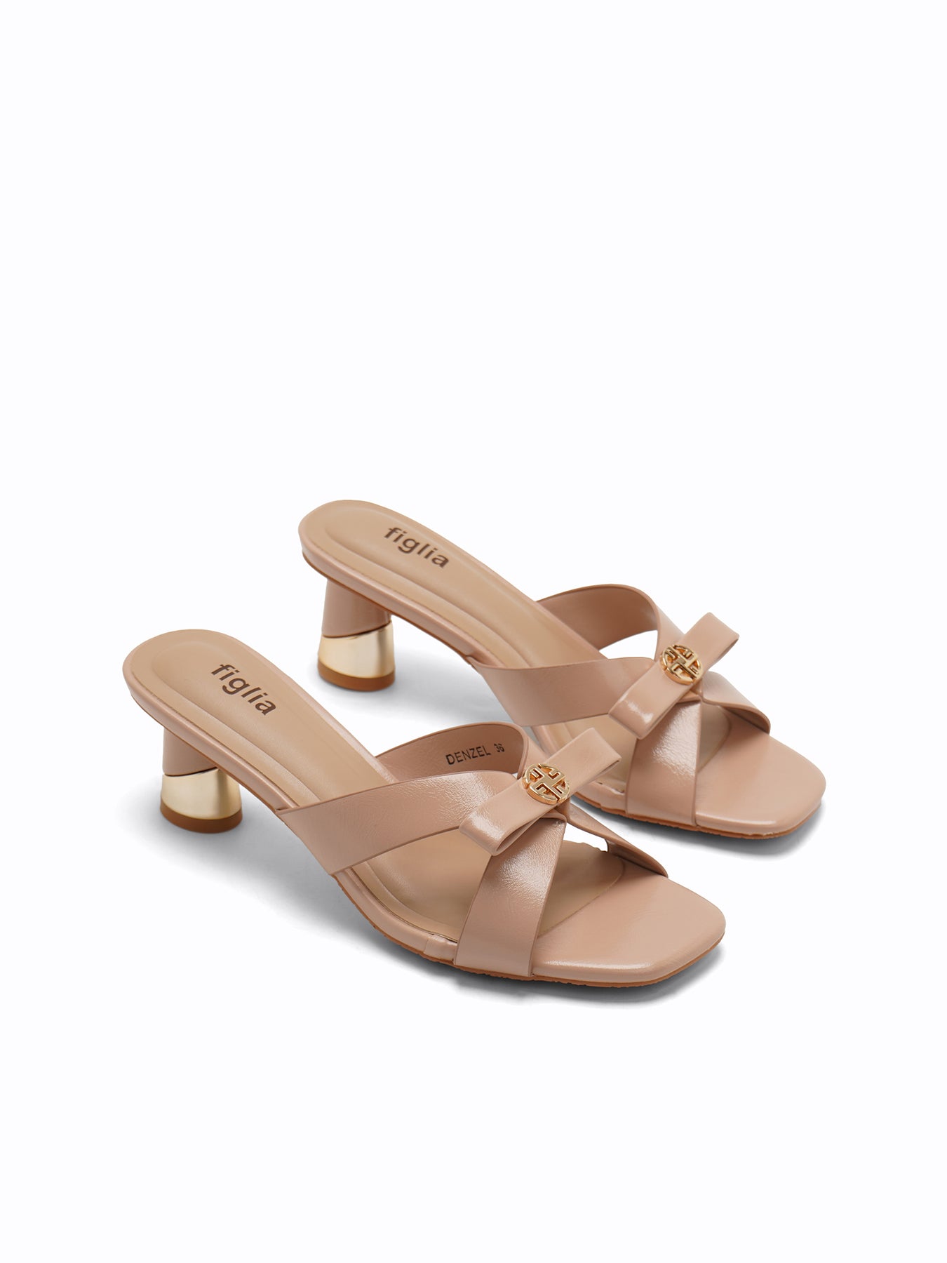 Elevate your look with the Denzel Heel Slides, a chic slide that embodies sophisticated charm. These open-toe slip-ons feature a smooth, blush-toned upper with an elegant crisscross strap design. The centerpiece is a feminine bow detail, accented by a subtle gold-toned medallion that adds a touch of signature glamour.