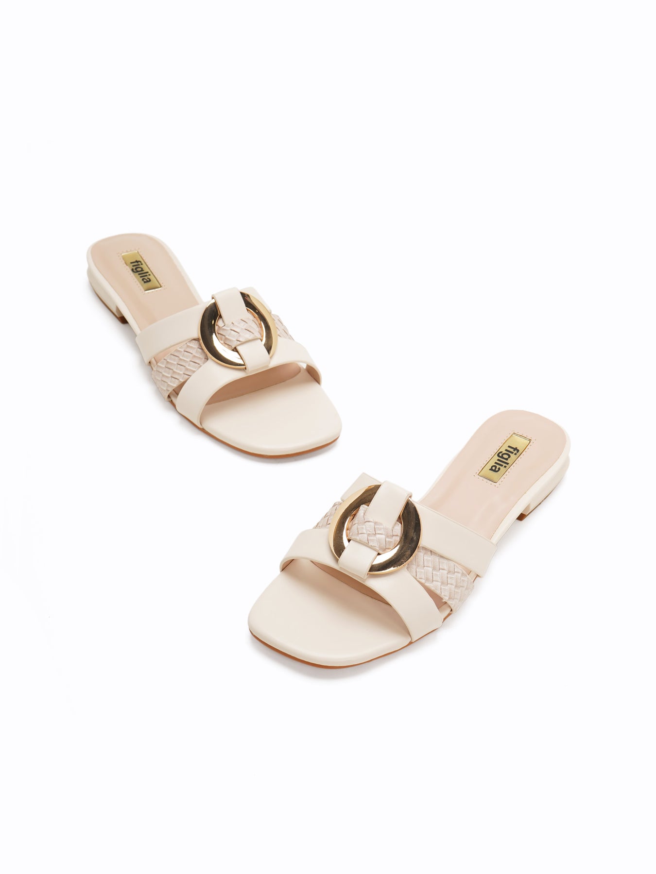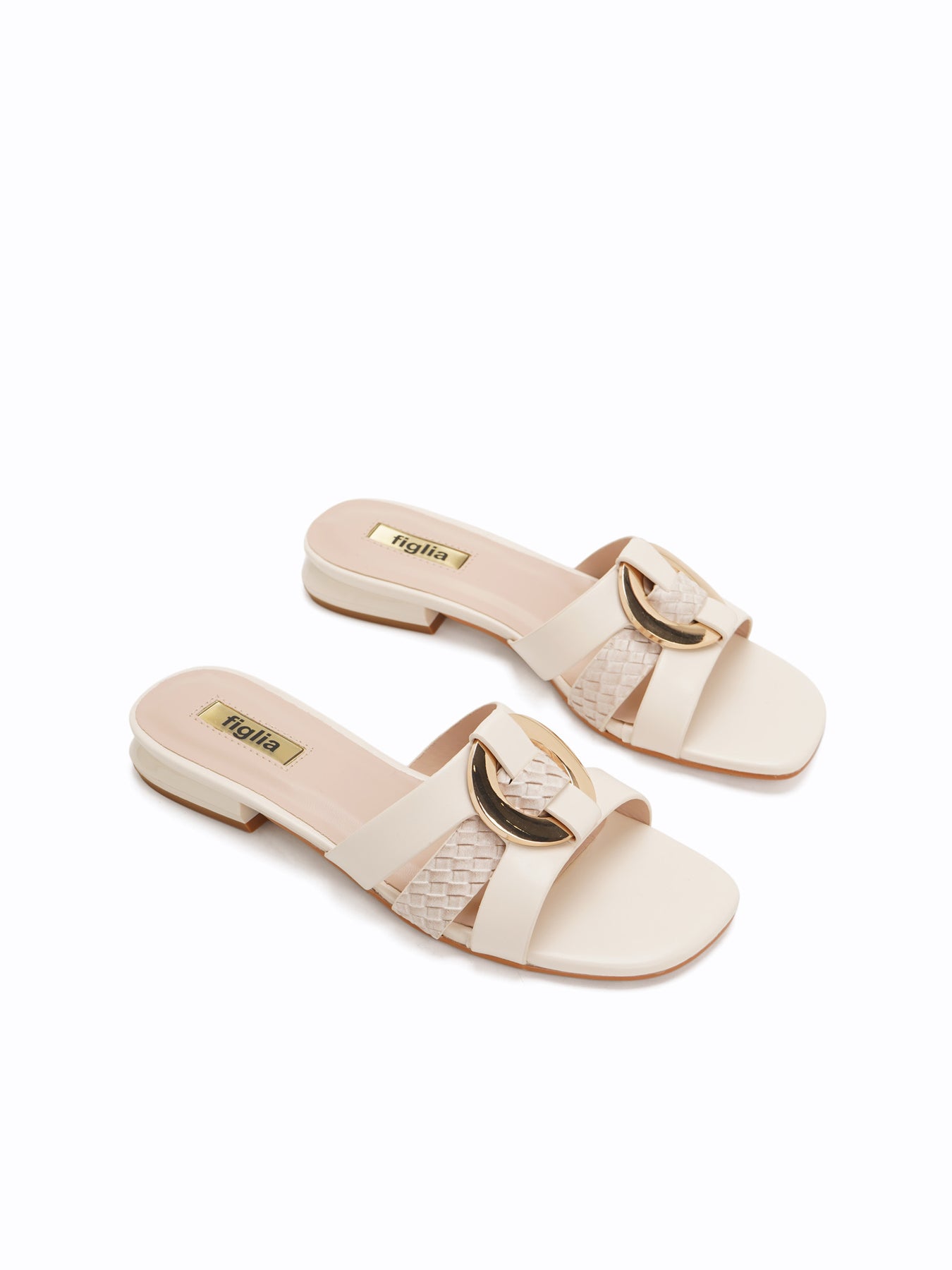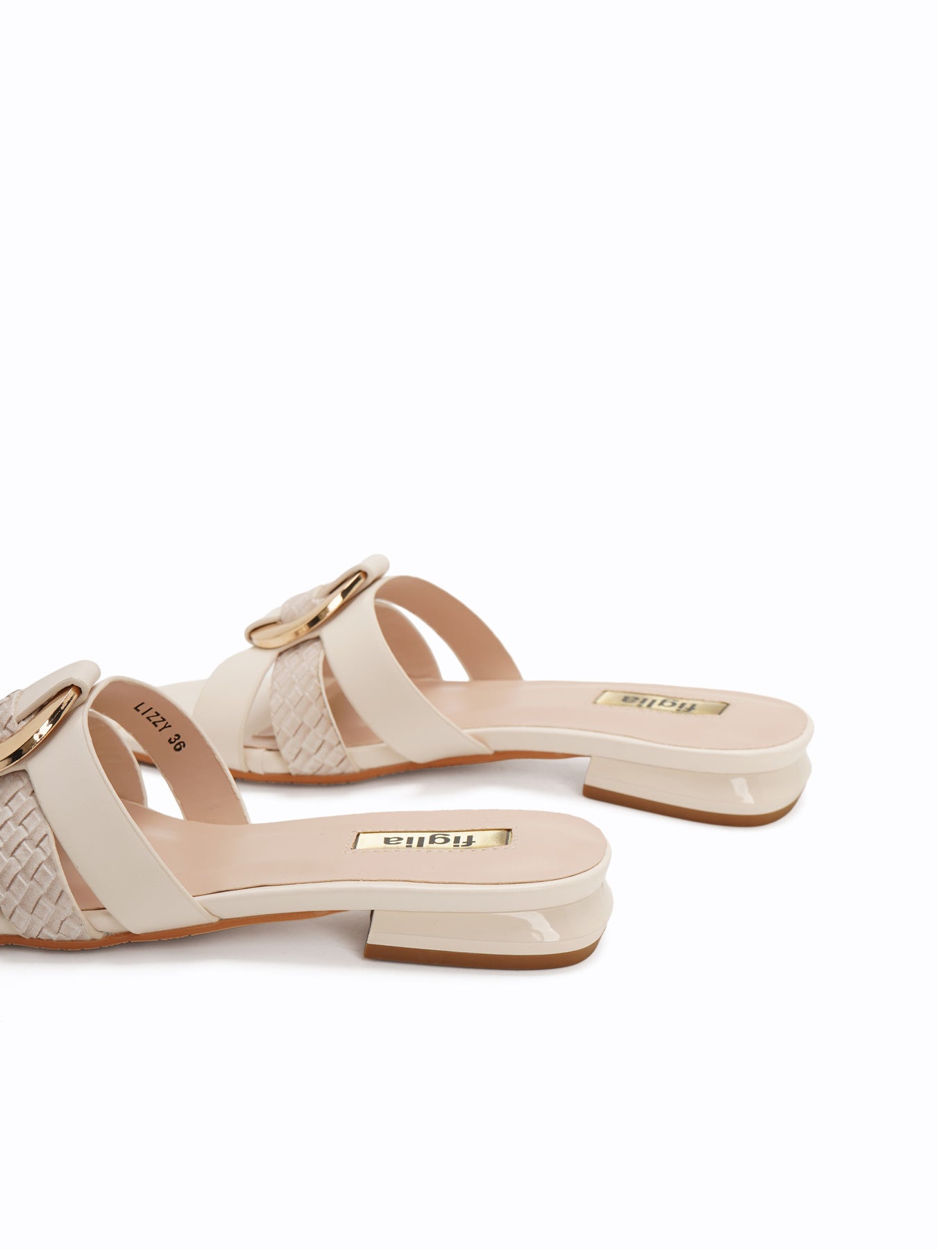 The Lizzy Flat Slides offer a chic and breezy look with their ivory square-toe design, featuring a unique combination of smooth and woven straps anchored by a bold, crescent-shaped gold buckle.