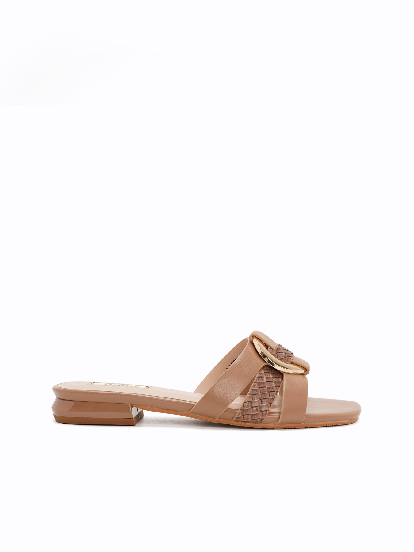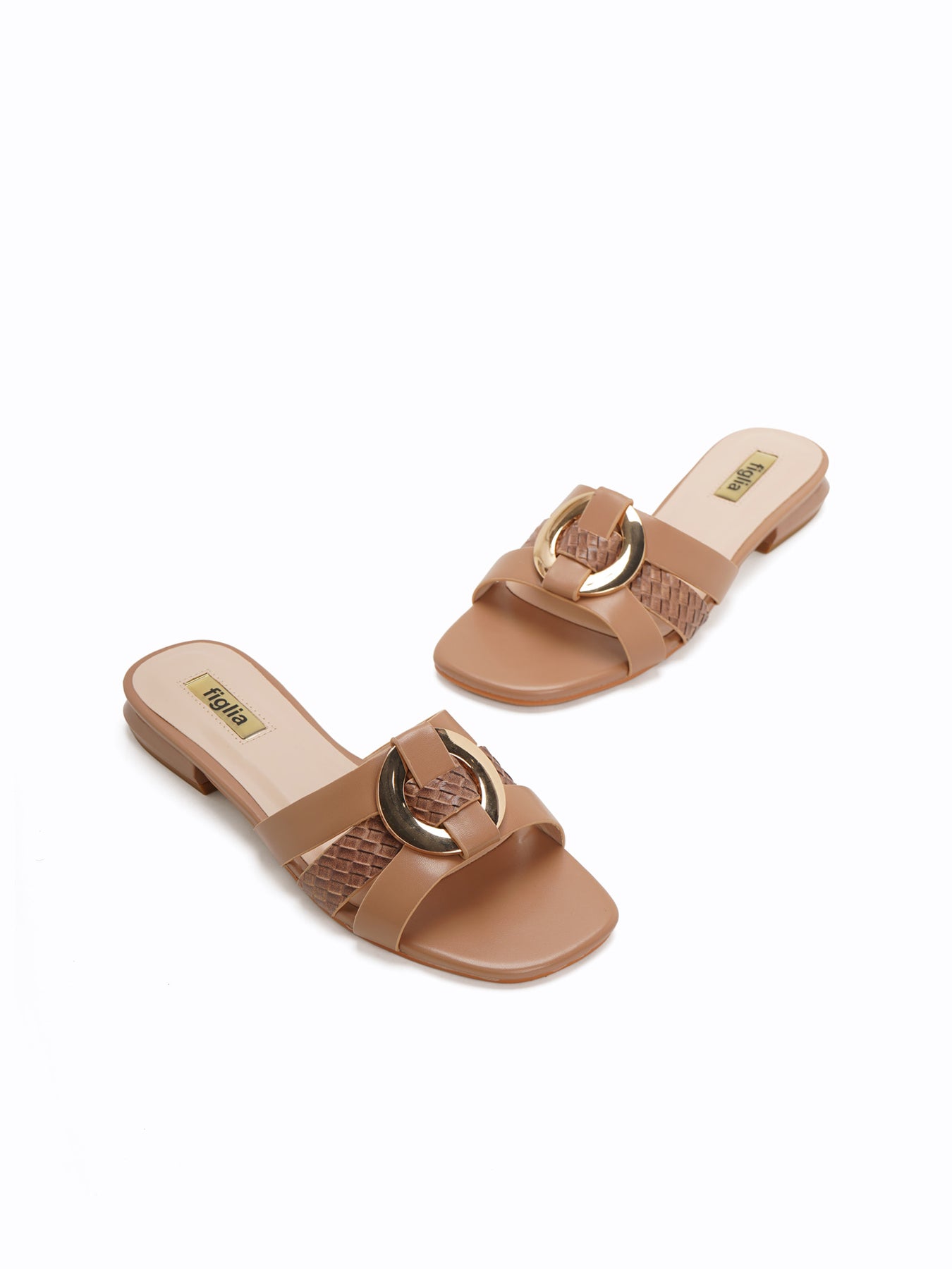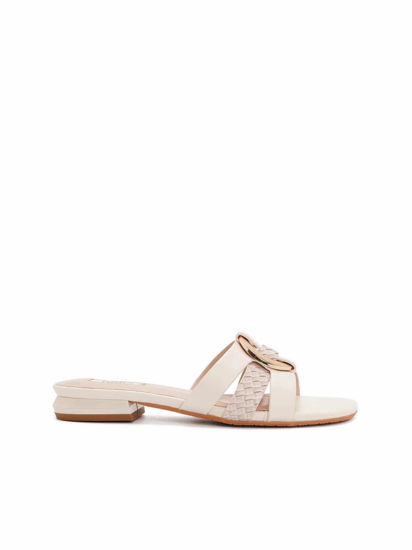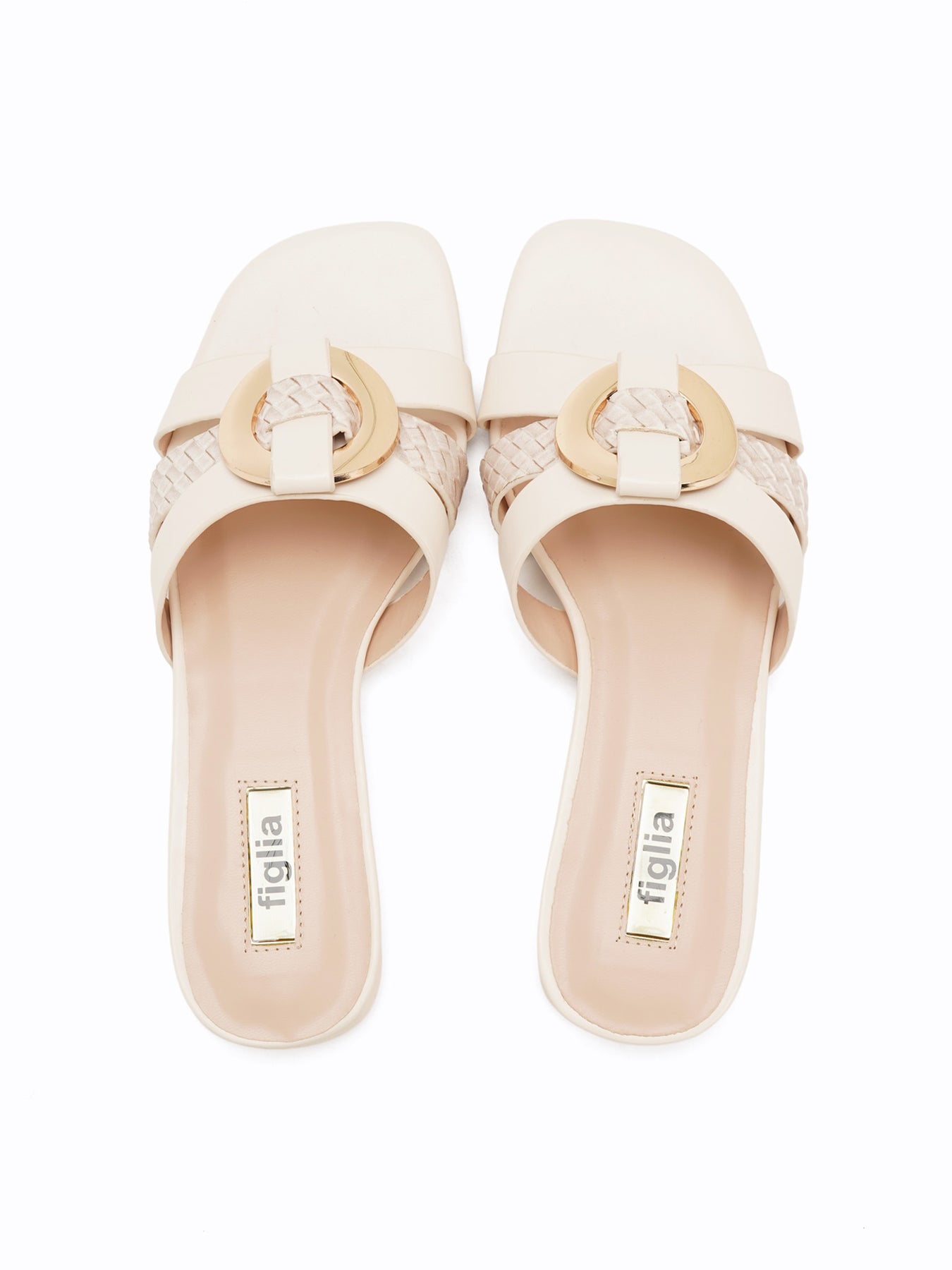 The Lizzy Flat Slides offer a chic and breezy look with their ivory square-toe design, featuring a unique combination of smooth and woven straps anchored by a bold, crescent-shaped gold buckle.