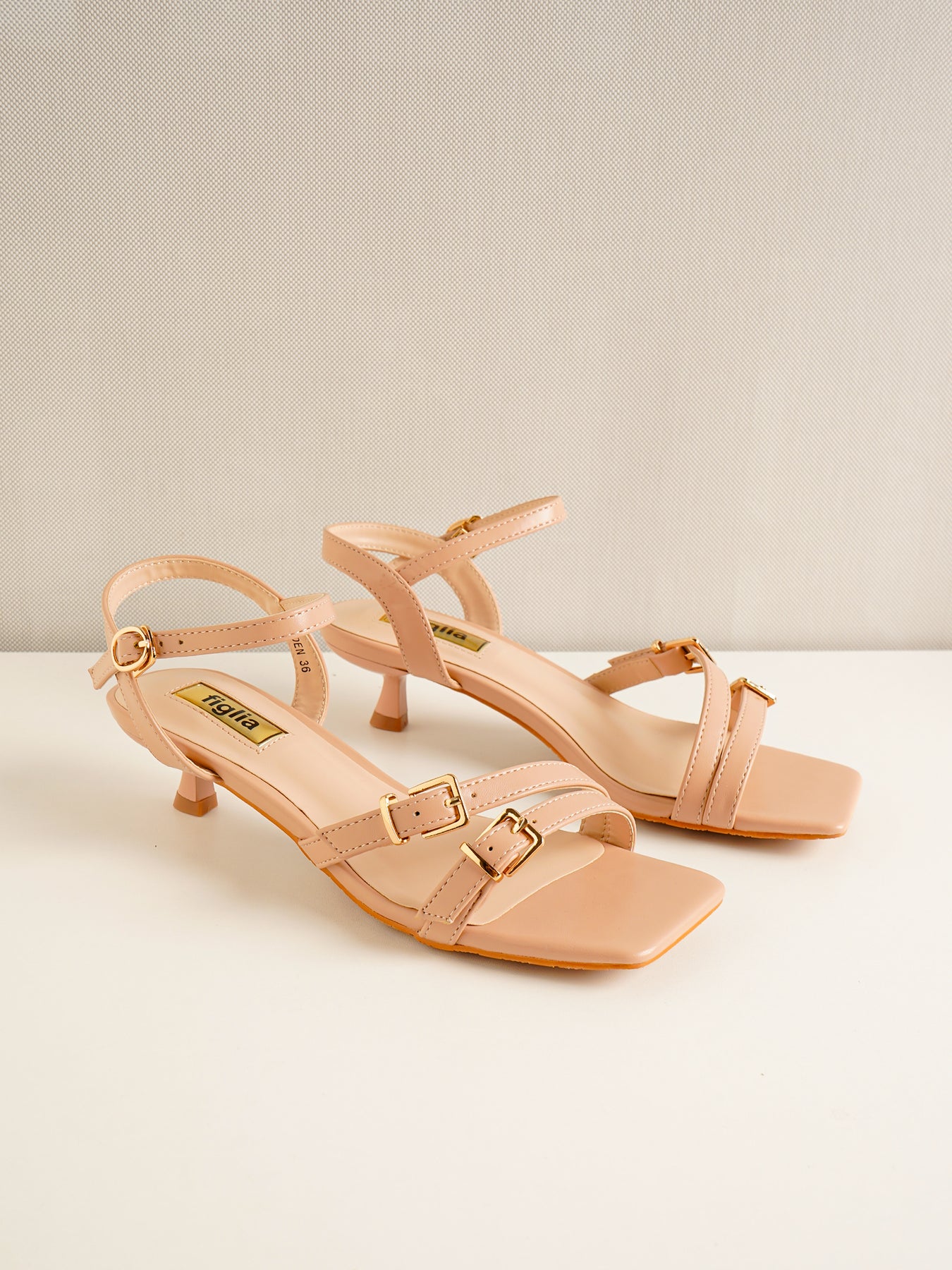 Achieve an effortlessly polished look with the Holden Heel Sandals, featuring a comfortable low kitten heel and a stylish square toe perfect for elevating any outfit; the upper is defined by dual straps with elegant gold-toned buckles, all secured with a slim, adjustable ankle strap, providing a sophisticated nude-toned finish for versatile styling.